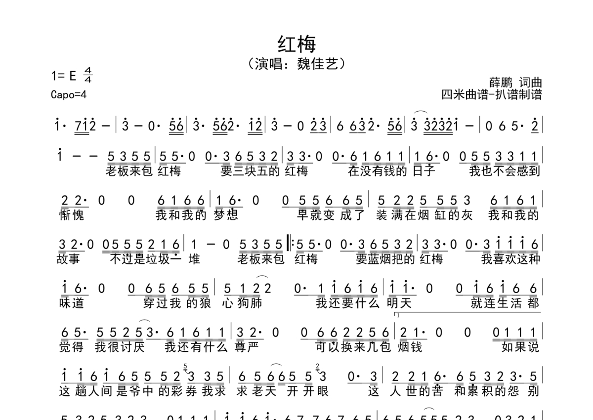 《红梅》是魏佳艺演唱的一首歌曲,拍号为4/4拍,这份简谱共有一张高清图谱,图谱由 @SRV7758521 编配上传。