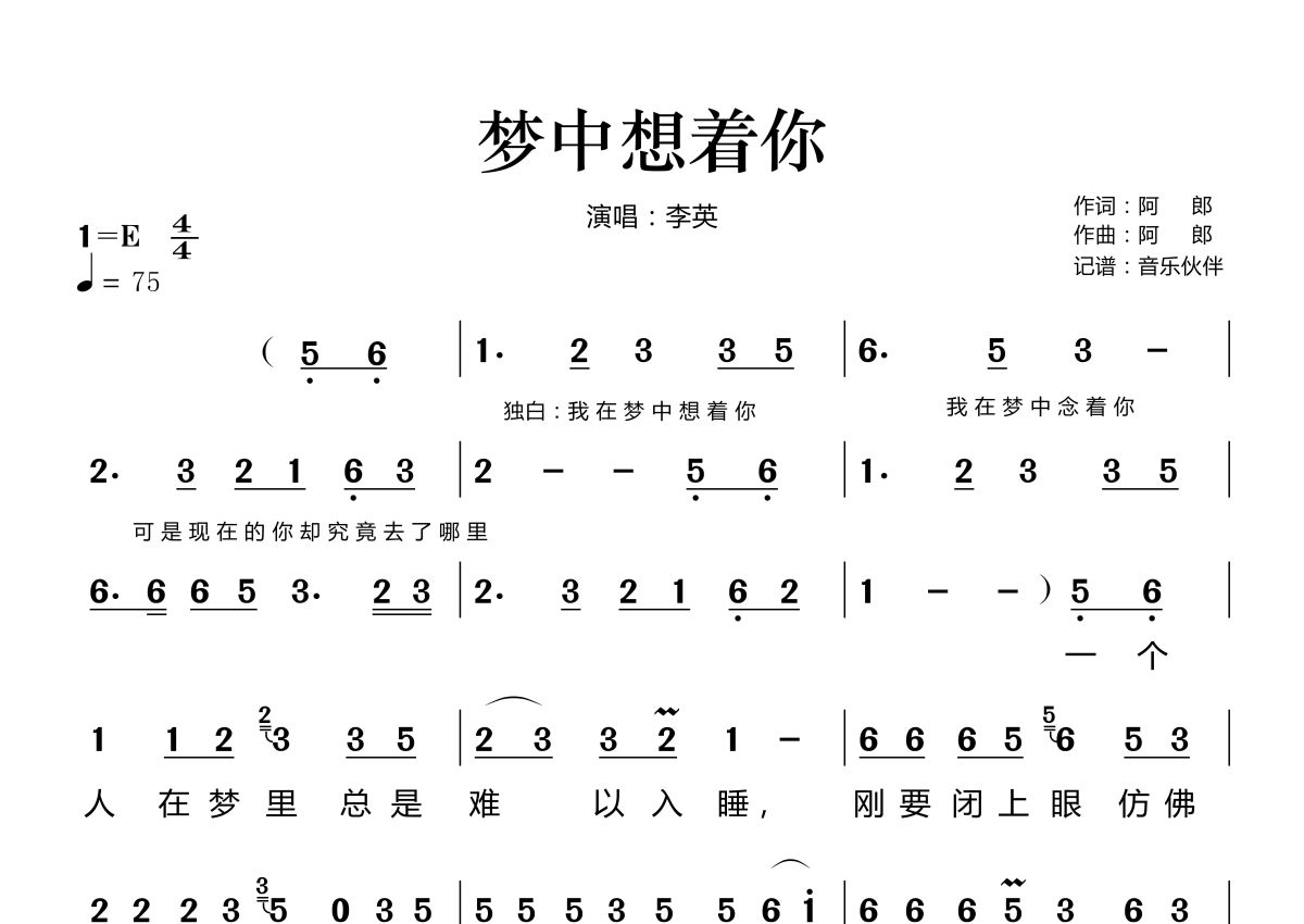 《梦中想着你》是李英演唱的一首歌曲,拍号为4/4拍,歌曲速度为每分钟75拍,这份简谱共有两张高清图谱,图谱由 @音乐伙伴 编配上传。