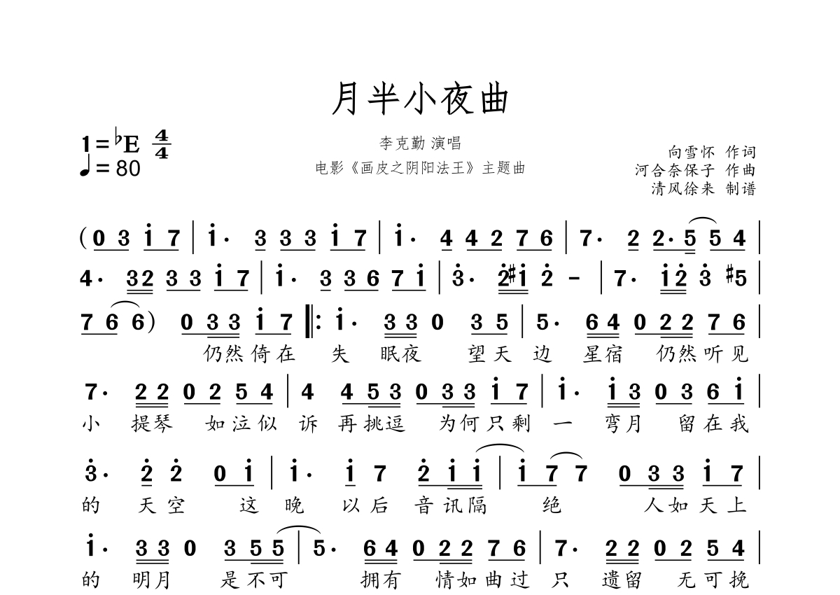 《月半小夜曲》是李克勤演唱的一首歌曲,拍号为4/4拍,这份简谱共有两张高清图谱,图谱由 @秋天的童话 编配上传。