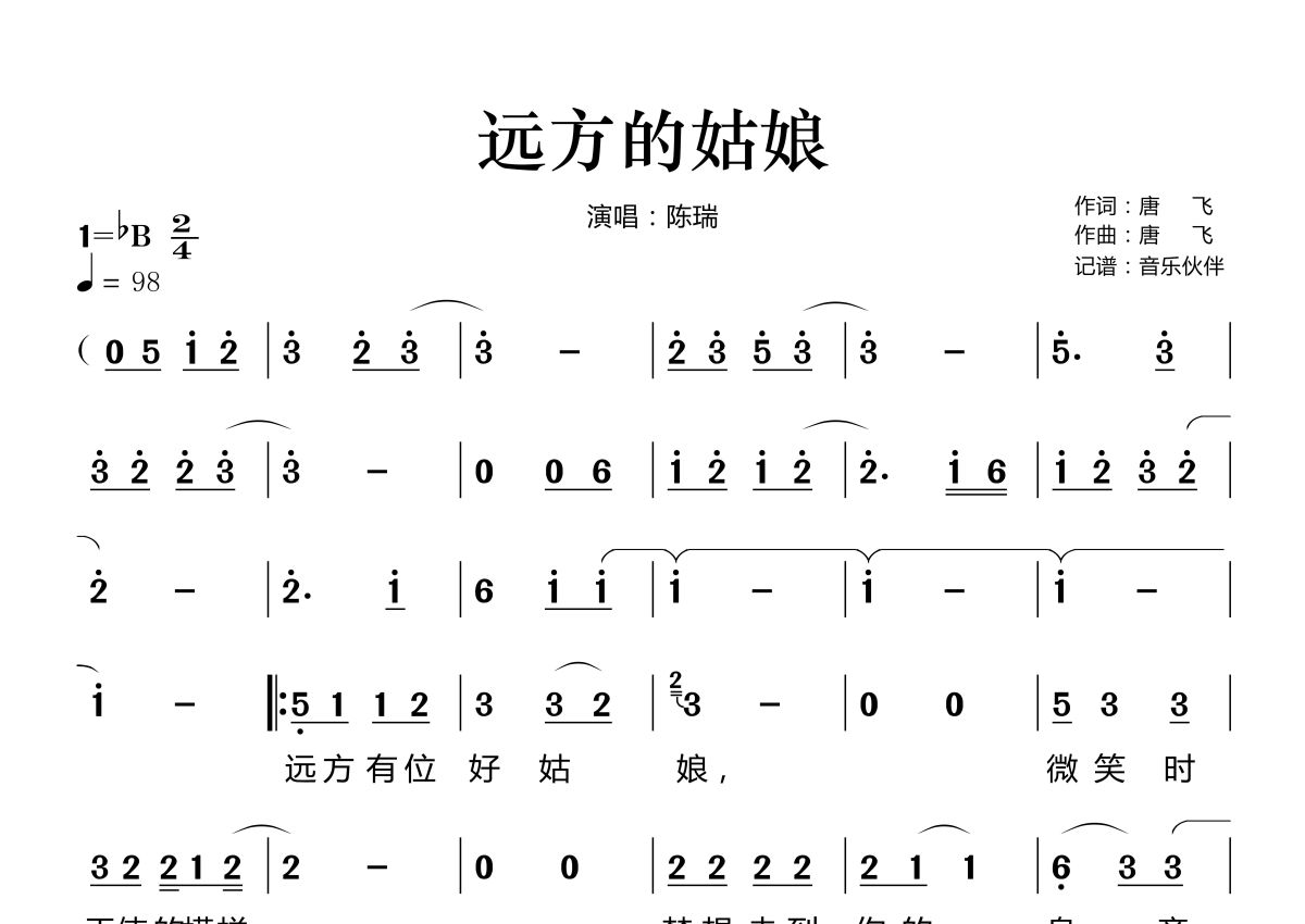 《远方的姑娘》是陈瑞演唱的一首歌曲,拍号为2/4拍,歌曲速度为每分钟98拍,这份简谱共有两张高清图谱,图谱由 @音乐伙伴 编配上传。
