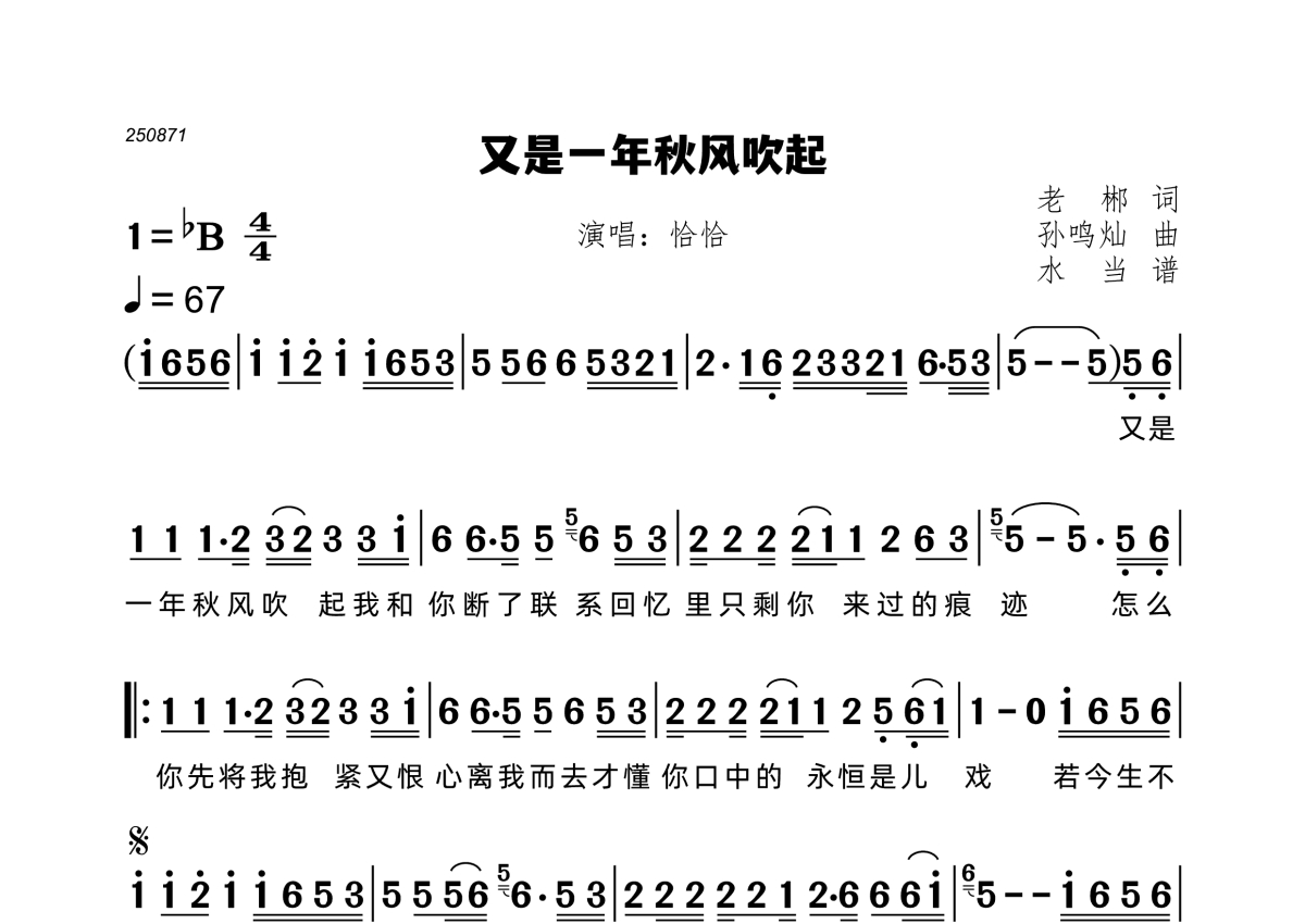 《又是一年秋风吹起》是恰恰恰恰恰演唱的一首歌曲,拍号为4/4拍,歌曲速度为每分钟67拍,这份简谱共有一张高清图谱,图谱由 @水当 编配上传。