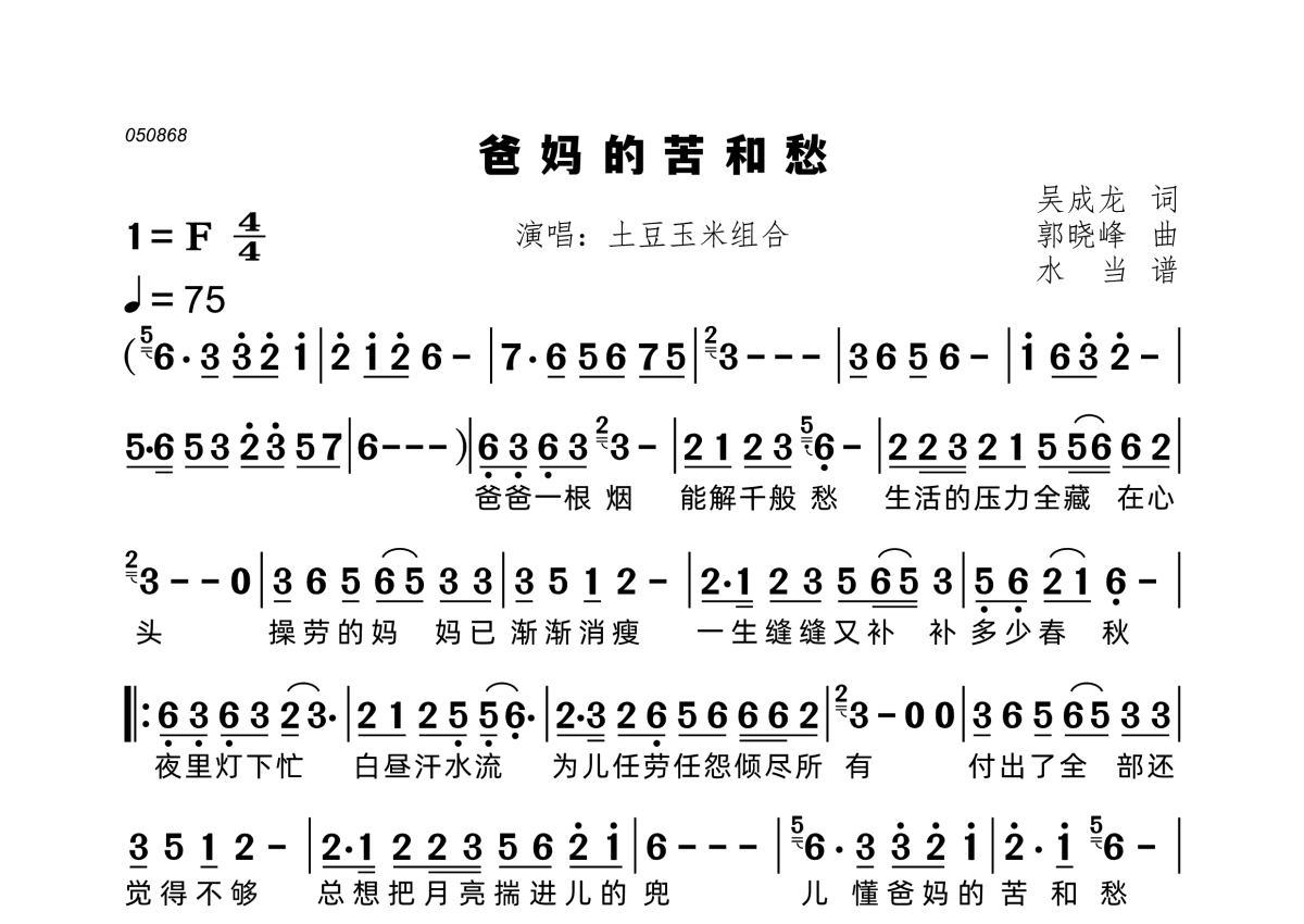 《爸妈的苦和愁》是土豆玉米组合演唱的一首歌曲,拍号为4/4拍,歌曲速度为每分钟75拍,这份简谱共有一张高清图谱,图谱由 @水当 编配上传。