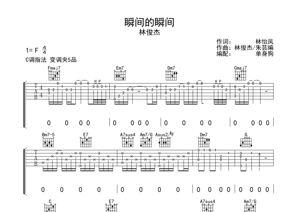 《瞬间的瞬间》是林俊杰演唱的一首歌曲,拍号为4/4拍,歌曲原调为F调,但由于原调指法比较难,为了方便弹奏,本吉他谱采用的是C调指法编配,变调夹5品弹奏即为原调,当然也可以根据自己的音域改变变调夹位置,或者通过改变和弦调性,以方便自己弹奏,这份吉他谱共有四张高清图谱,图谱由 @单身狗 编配上传,图谱使用六线谱编配,包含吉他和弦指法、简谱以及歌词部分,使用这份瞬间的瞬间吉他谱,可以让你更加方便地掌握这首歌曲的弹唱技巧,快来尝试吧。