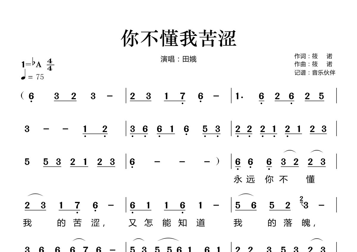 你不懂我苦涩简谱 - 田娥演唱