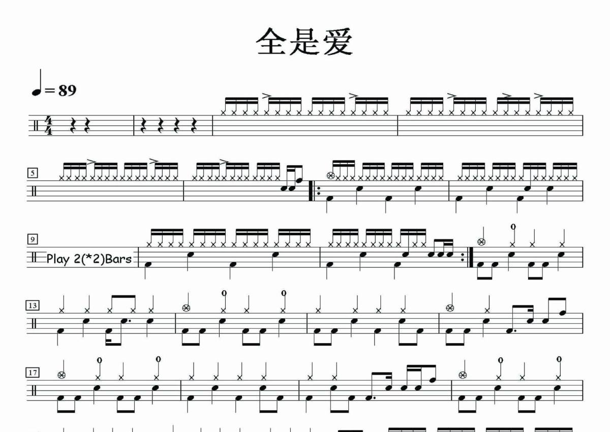 《全是爱》是Beyond演唱的一首歌曲,拍号为4/4拍,歌曲速度为每分钟89拍,这份架子鼓谱共有两张高清图谱,图谱由 @音符喷血者 编配上传,图谱使用五线谱编配,使用这份全是爱架子鼓谱,你将能够轻松地敲打出这首Beyond的全是爱,快来尝试吧。