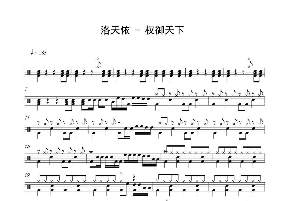 《权御天下》是洛天依演唱的一首歌曲,拍号为4/4拍,歌曲速度为每分钟185拍,这份架子鼓谱共有三张高清图谱,图谱由 @音符喷血者 编配上传,图谱使用五线谱编配,使用这份权御天下架子鼓谱,你将能够轻松地敲打出这首洛天依的权御天下,快来尝试吧。