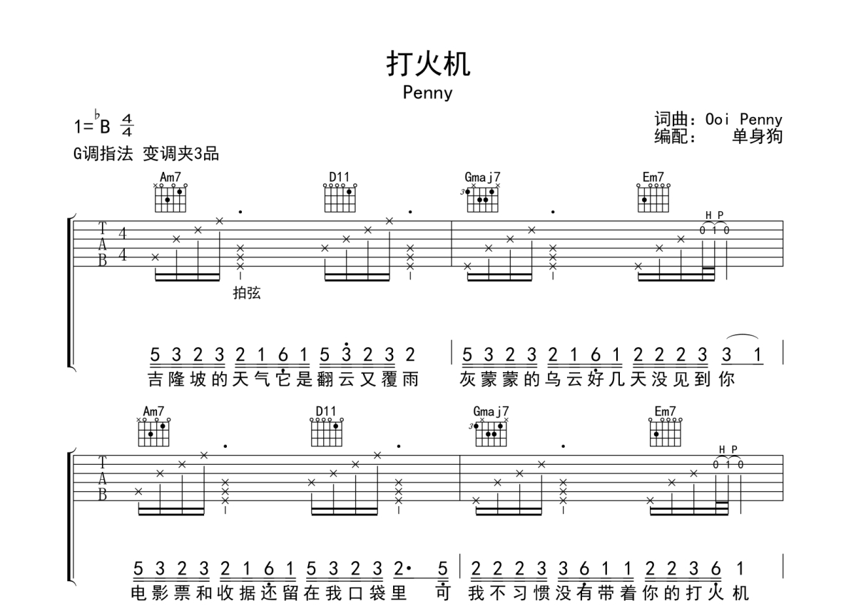 Penny《打火机》吉他谱 - G调弹唱六线谱