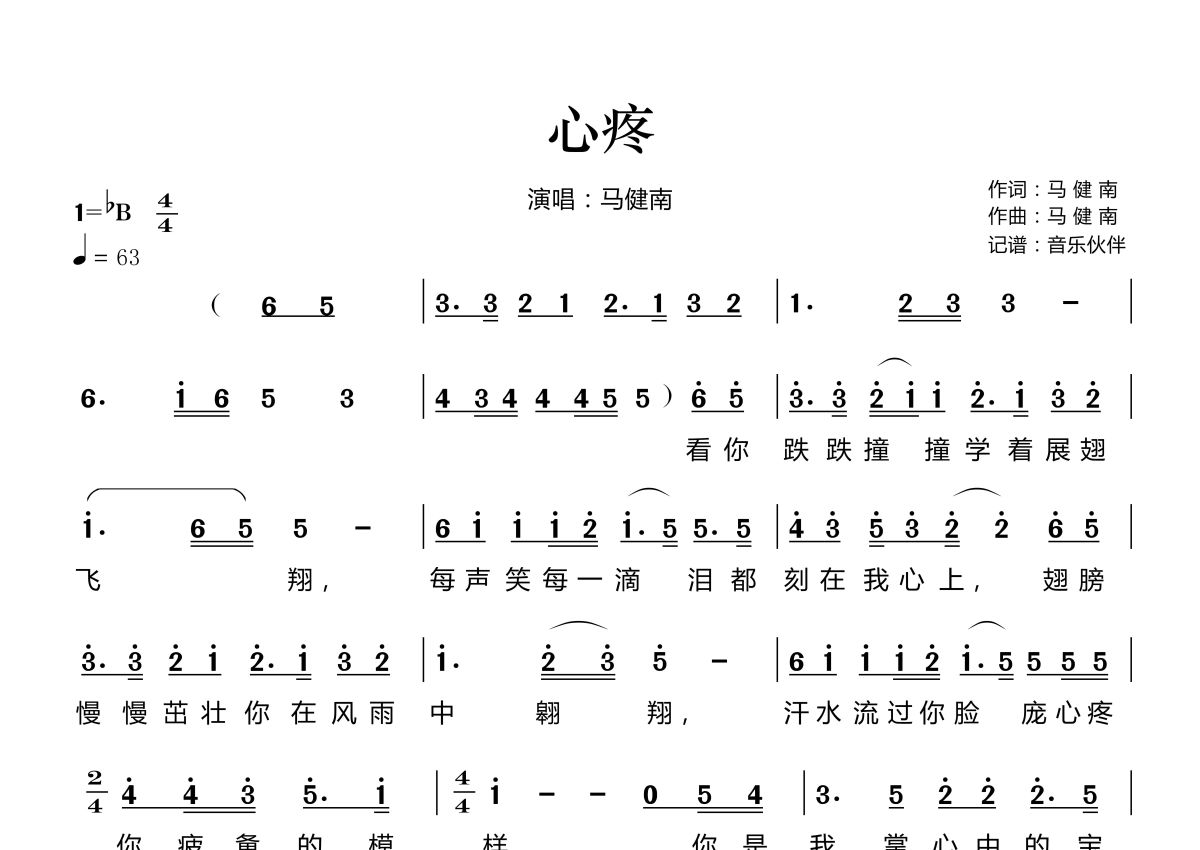 《心疼》是马健南演唱的一首歌曲,拍号为4/4拍,歌曲速度为每分钟63拍,这份简谱共有两张高清图谱,图谱由 @音乐伙伴 编配上传。