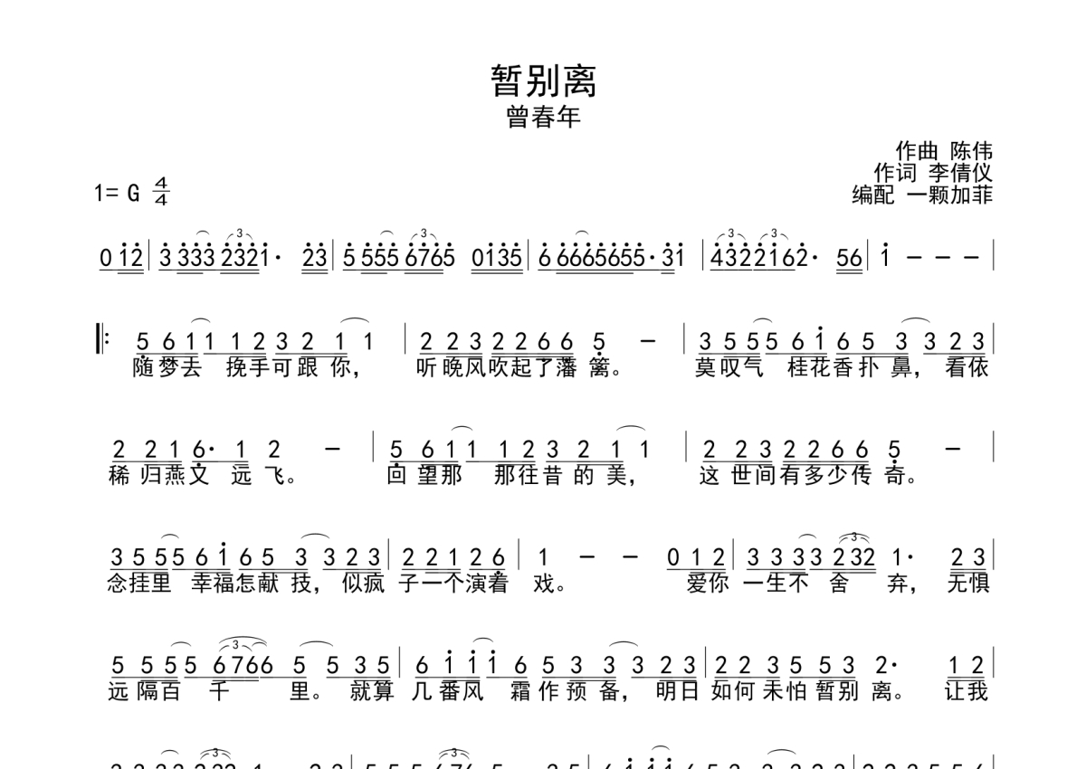 《暂别离》是曾春年演唱的一首歌曲,这份简谱共有一张高清图谱,图谱由 @一颗加菲 编配上传。