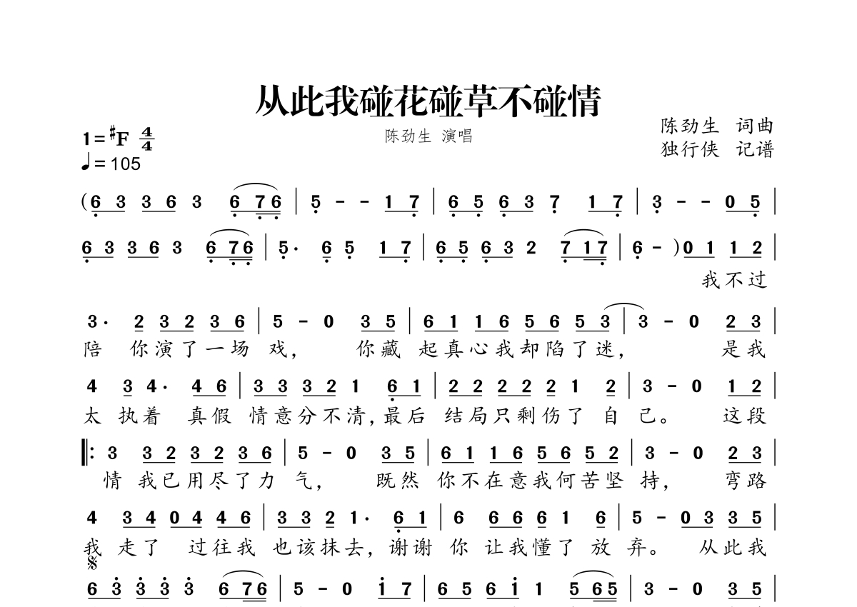《从此我碰花碰草不碰情》是陈劲生演唱的一首歌曲,拍号为4/4拍,歌曲速度为每分钟105拍,这份简谱共有一张高清图谱,图谱由 @独行侠 编配上传。