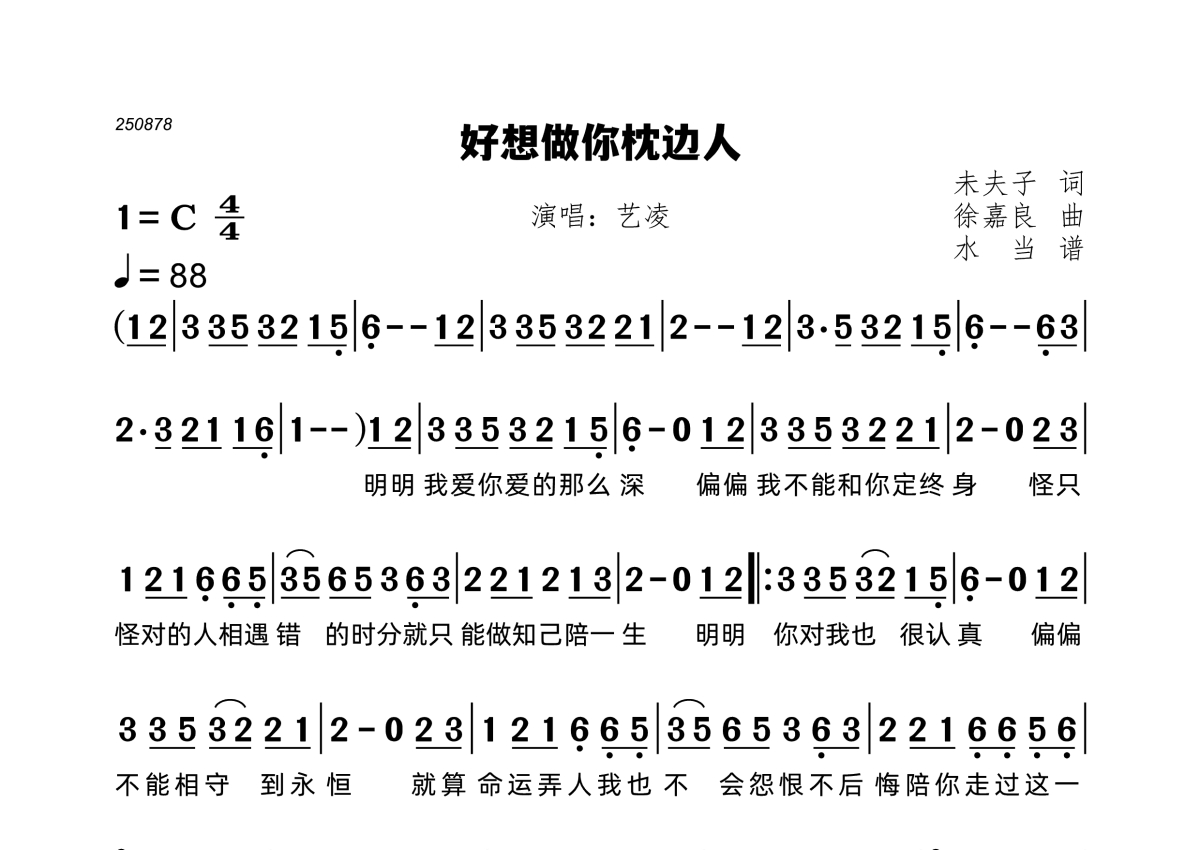 《好想做你枕边人》是艺凌演唱的一首歌曲,拍号为4/4拍,歌曲速度为每分钟88拍,这份简谱共有一张高清图谱,图谱由 @水当 编配上传。