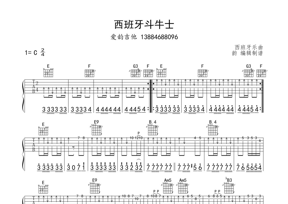 《斗牛士》是西班牙曲演唱的一首歌曲,本吉他谱采用的是C调指法编配,这份吉他谱共有两张高清图谱,图谱由 @爱韵夏君 编配上传,图谱使用六线谱编配,使用这份斗牛士吉他谱,可以让你更加方便地掌握这首歌曲的演奏技巧,快来尝试吧。西班牙曲《斗牛士》吉他谱_C调吉他独奏谱。