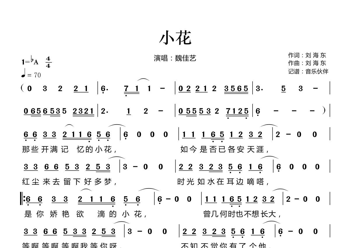 《小花》是魏佳艺演唱的一首歌曲,拍号为4/4拍,歌曲速度为每分钟70拍,这份简谱共有一张高清图谱,图谱由 @音乐伙伴 编配上传。