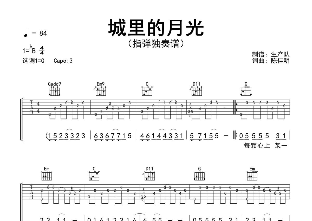 《城里的月光》是许美静演唱的一首歌曲,指弹独奏谱,拍号为4/4拍,歌曲速度为每分钟84拍,歌曲原调为Bb调,但由于原调指法比较难,为了方便弹奏,本吉他谱采用的是G调指法编配,变调夹3品弹奏即为原调,当然也可以根据自己的音域改变变调夹位置,或者通过改变和弦调性,以方便自己弹奏,这份吉他谱共有两张高清图谱,图谱由 @生产队 编配上传,图谱使用六线谱编配,使用这份城里的月光吉他谱,可以让你更加方便地掌握这首歌曲的演奏技巧,快来尝试吧。许美静演唱的经典歌曲《城里的月光》指弹独奏谱,含前奏、间奏solo编配,怀旧经典,吉他必弹曲目,值得推荐!。