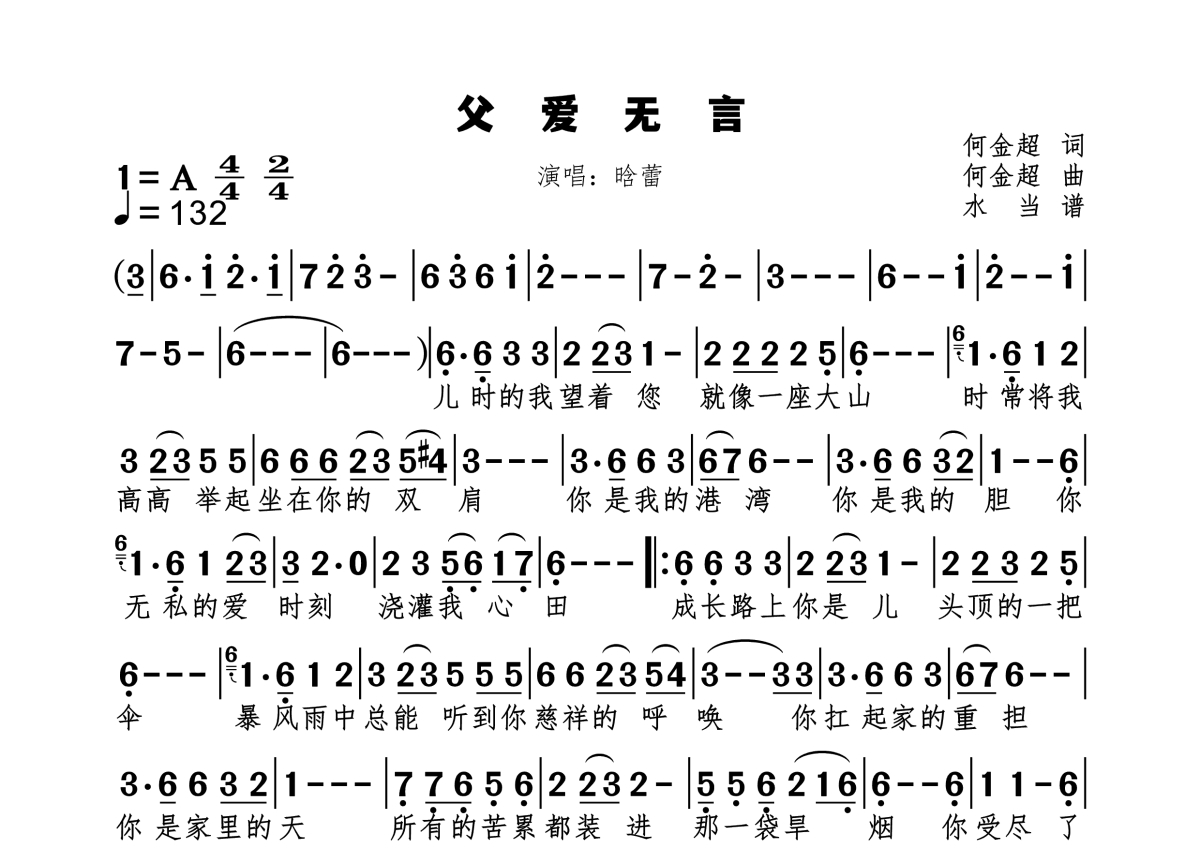 《父爱无言》是晗蕾演唱的一首歌曲,拍号为4/4拍,歌曲速度为每分钟132拍,这份简谱共有一张高清图谱,图谱由 @水当 编配上传。