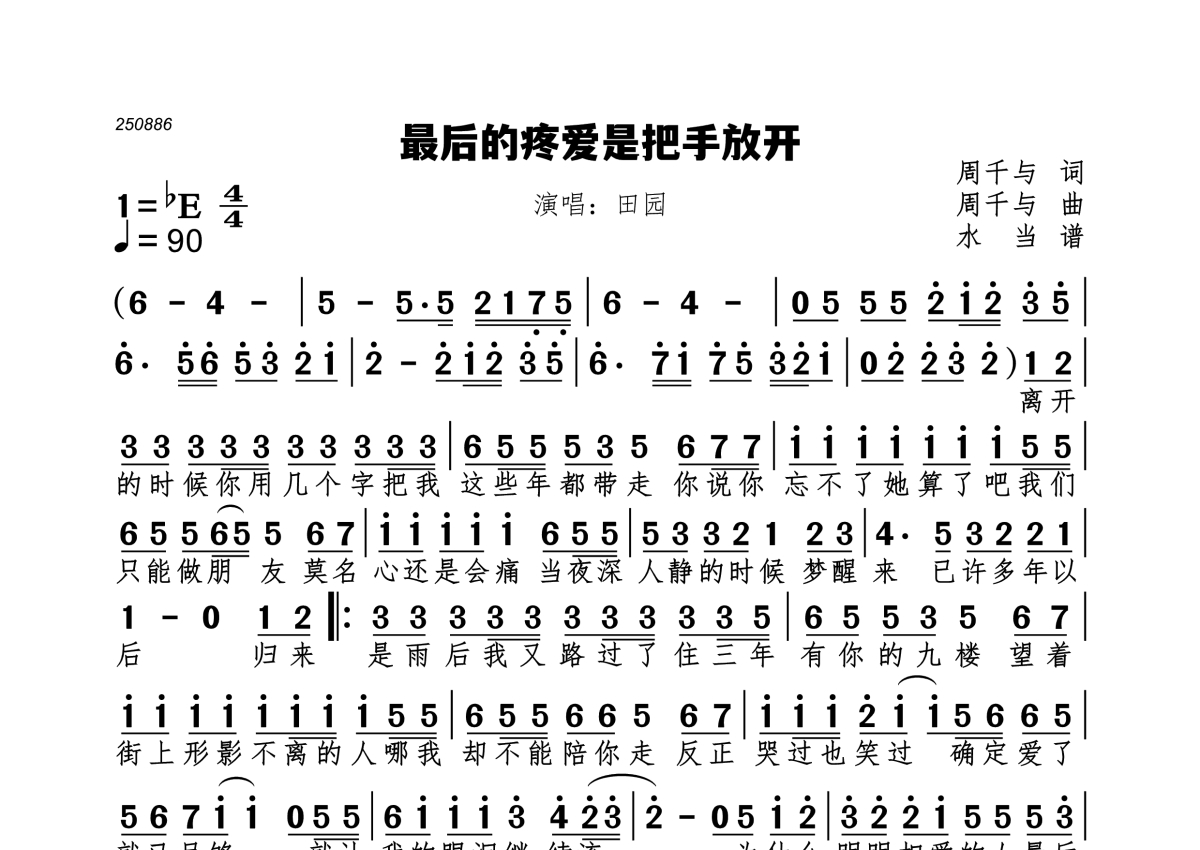 《最后的疼爱是把手放开》是田园演唱的一首歌曲,拍号为4/4拍,歌曲速度为每分钟90拍,这份简谱共有一张高清图谱,图谱由 @水当 编配上传。