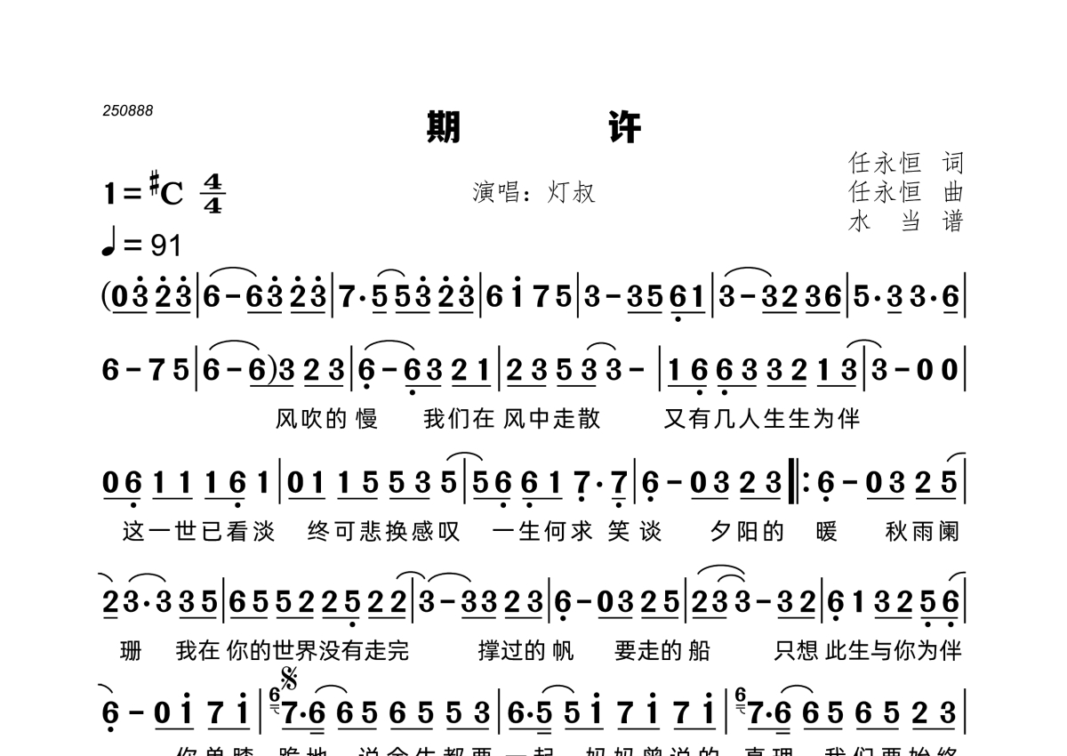 《期许》是灯叔演唱的一首歌曲,拍号为4/4拍,歌曲速度为每分钟91拍,这份简谱共有一张高清图谱,图谱由 @水当 编配上传。