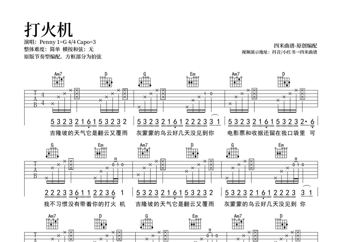 打火机吉他谱 - Penny演唱 - G调弹唱六线谱