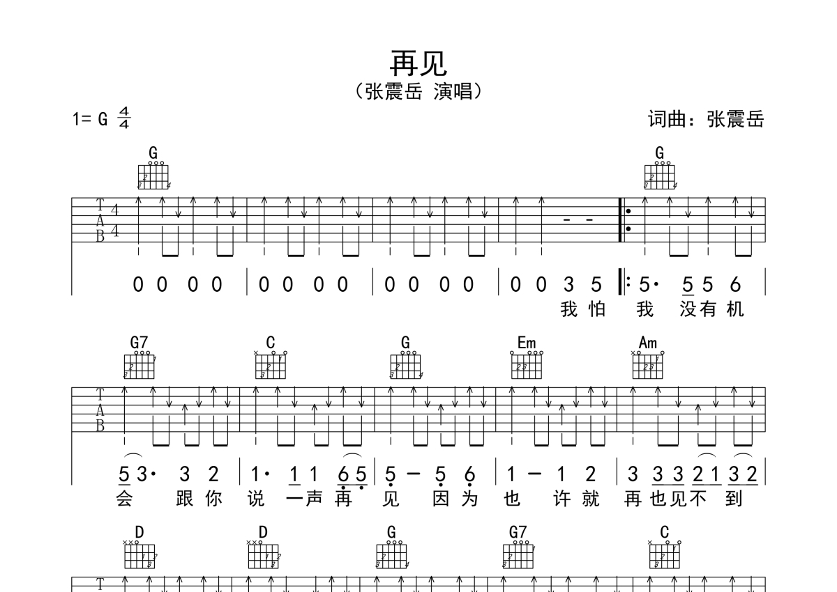 《再见》吉他谱 - 张震岳 - G调弹唱六线谱