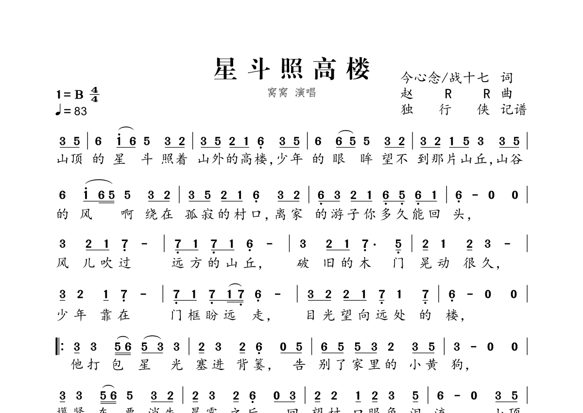 《星斗照高楼》是窝窝演唱的一首歌曲,拍号为4/4拍,歌曲速度为每分钟83拍,这份简谱共有一张高清图谱,图谱由 @独行侠 编配上传。