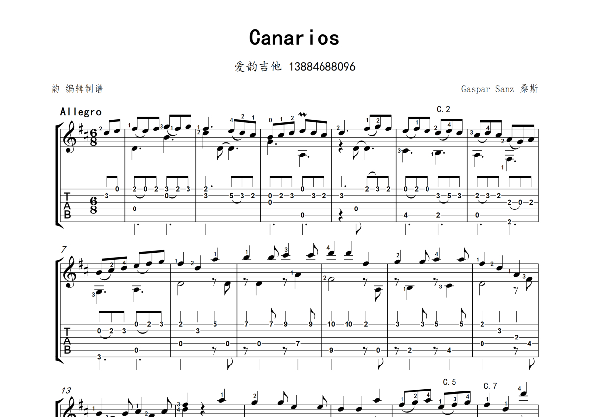 《canarios》是韵演唱的一首歌曲,本吉他谱采用的是D调指法编配,这份吉他谱共有两张高清图谱,图谱由 @爱韵夏君 编配上传,图谱使用六线谱编配,使用这份canarios吉他谱,可以让你更加方便地掌握这首歌曲的演奏技巧,快来尝试吧。古典吉他独奏。