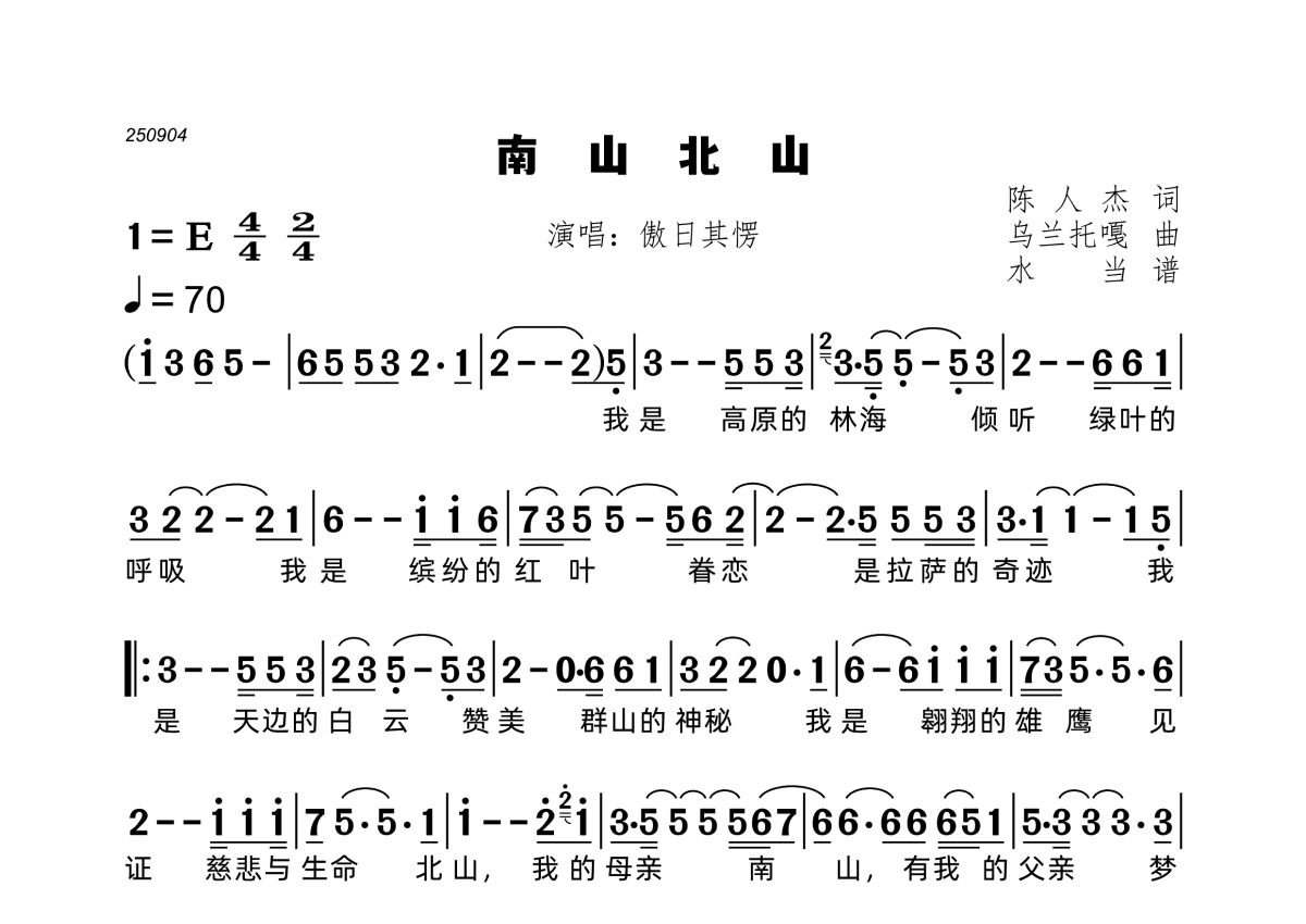 《南山北山》是傲日其愣演唱的一首歌曲,拍号为4/4拍,歌曲速度为每分钟70拍,这份简谱共有一张高清图谱,图谱由 @水当 编配上传。