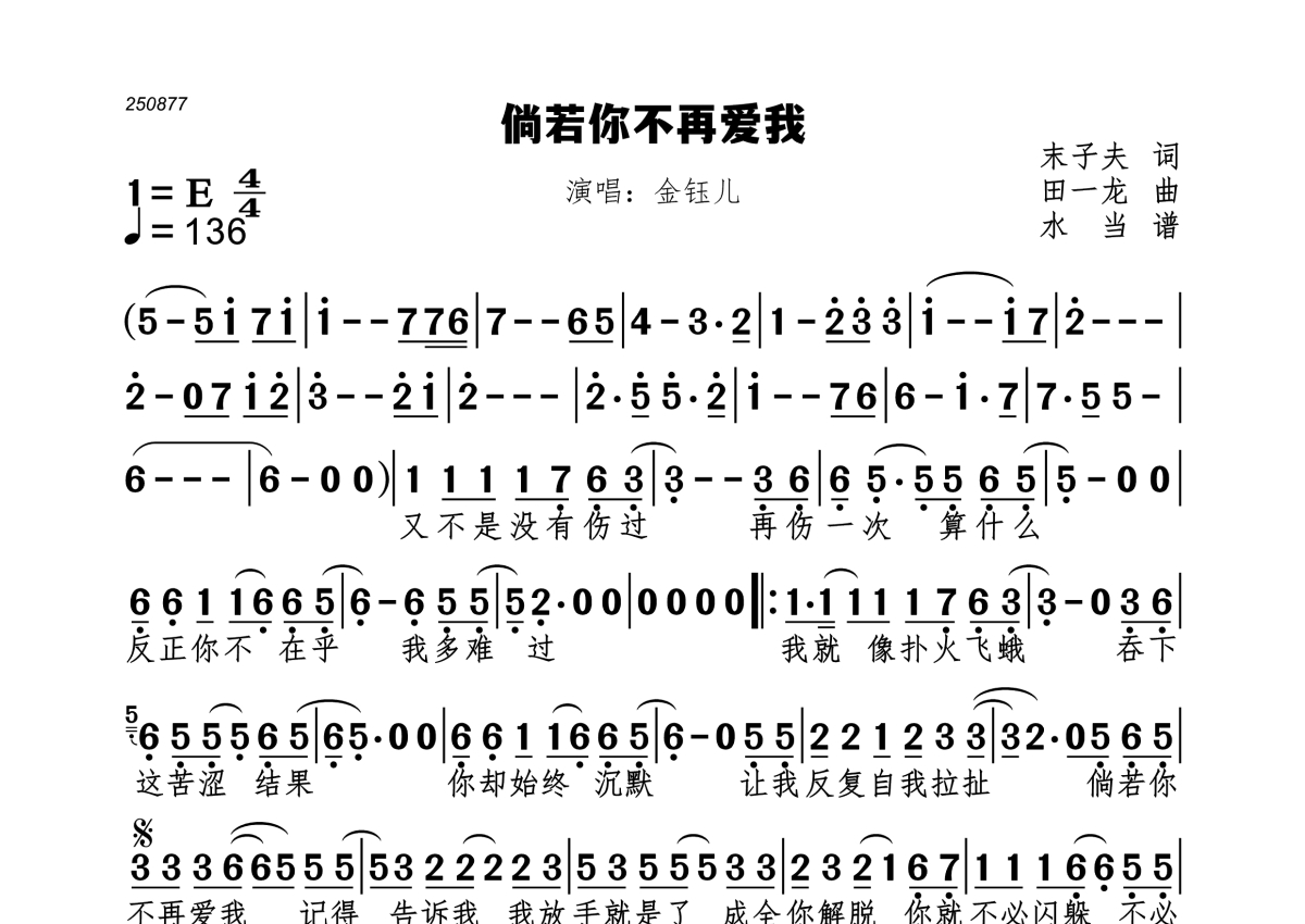 《倘若你不再爱我》是金钰儿演唱的一首歌曲,拍号为4/4拍,歌曲速度为每分钟136拍,这份简谱共有一张高清图谱,图谱由 @水当 编配上传。