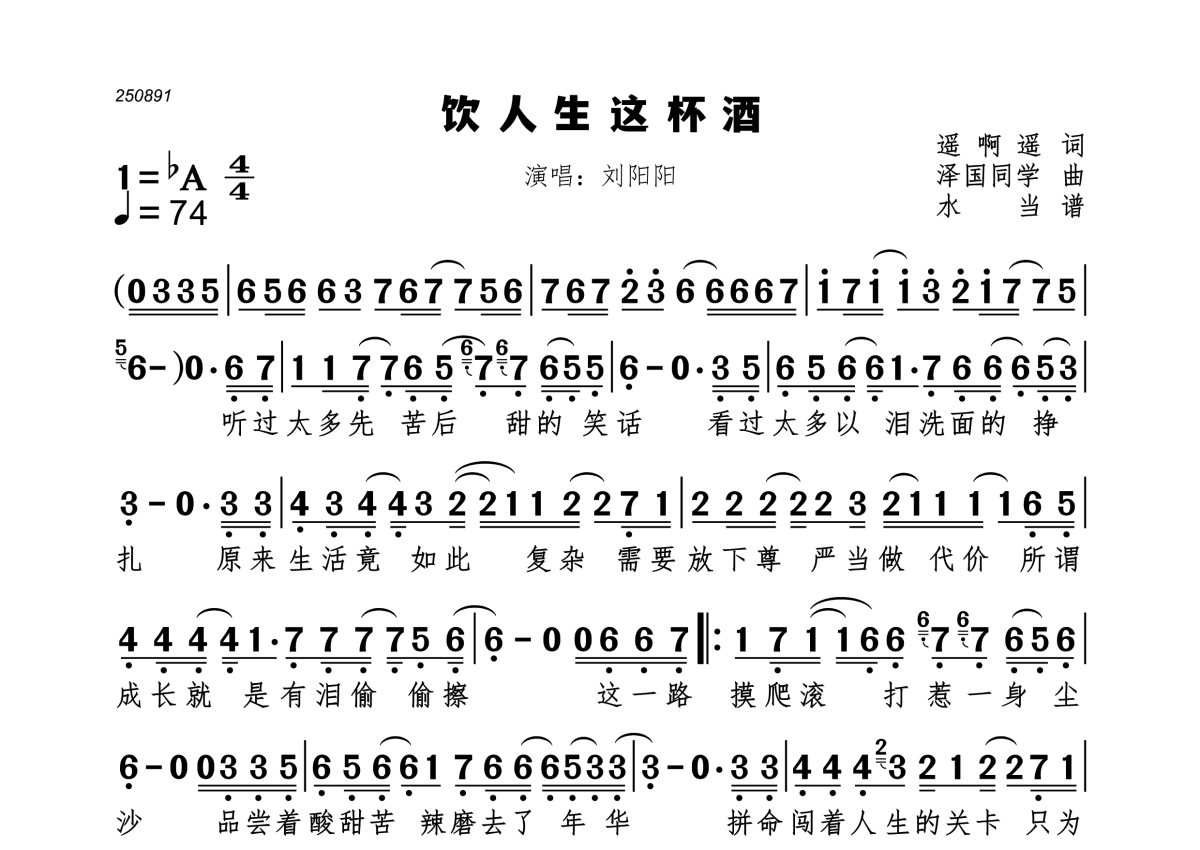 《饮人生这杯酒》是刘阳阳演唱的一首歌曲,拍号为4/4拍,歌曲速度为每分钟74拍,这份简谱共有一张高清图谱,图谱由 @水当 编配上传。