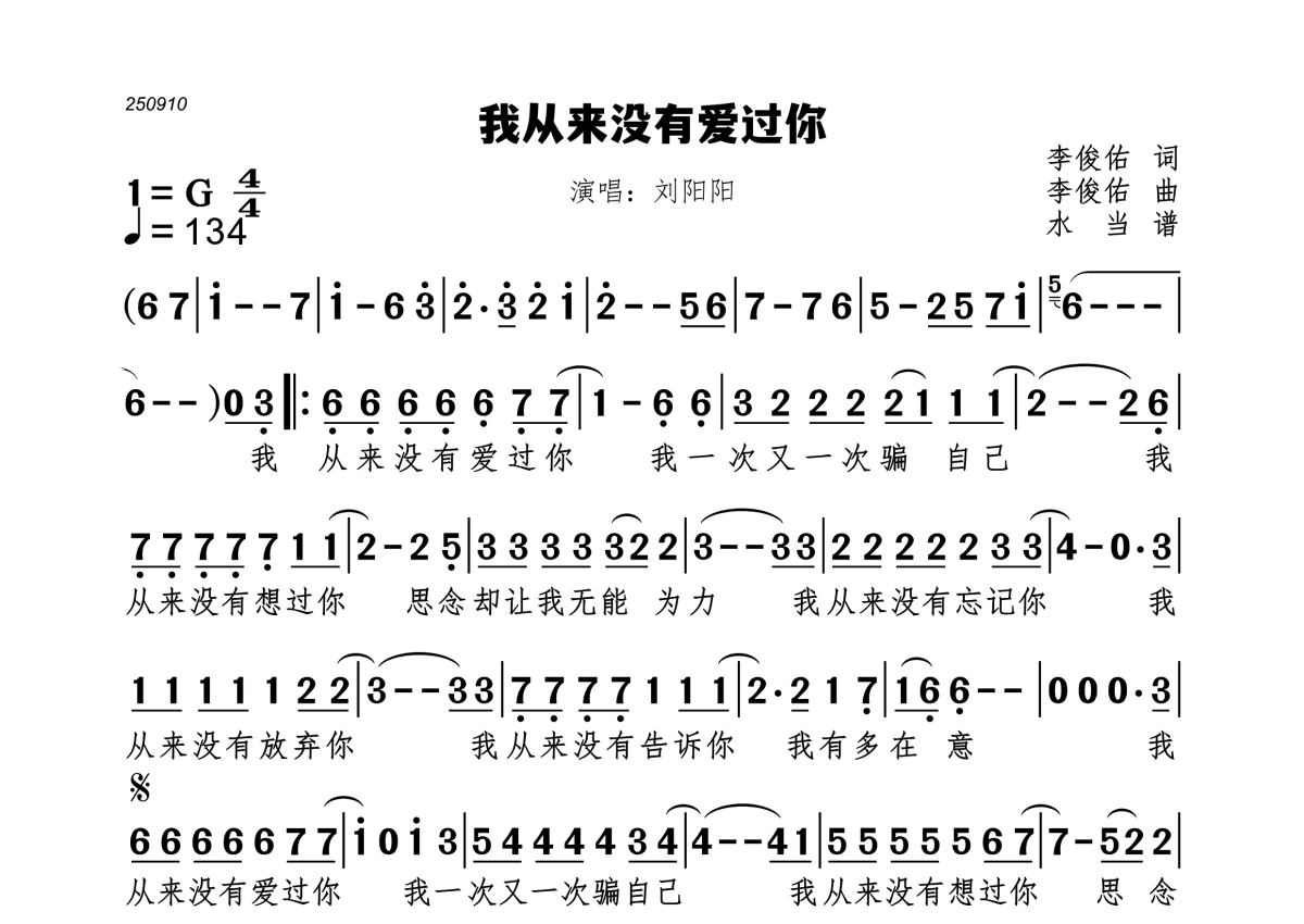 《我从来没有爱过你》是刘阳阳演唱的一首歌曲,拍号为4/4拍,歌曲速度为每分钟134拍,这份简谱共有一张高清图谱,图谱由 @水当 编配上传。