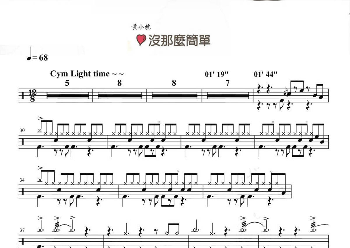 《没那么简单》是黄小琥演唱的一首歌曲,歌曲速度为每分钟68拍,这份架子鼓谱共有两张高清图谱,图谱由 @音符喷血者 编配上传,图谱使用五线谱编配,使用这份没那么简单架子鼓谱,你将能够轻松地敲打出这首黄小琥的没那么简单,快来尝试吧。