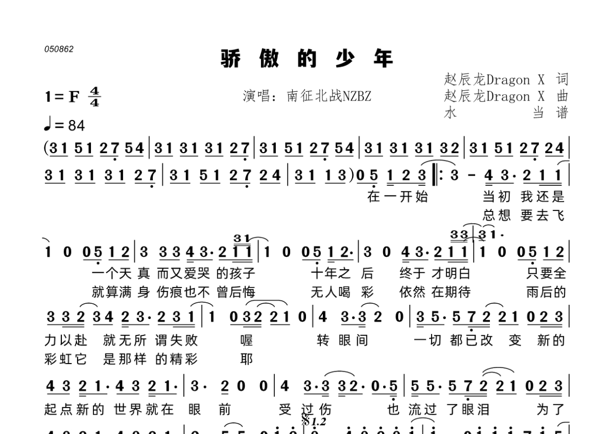《骄傲的少年》是南征北战NZBZ演唱的一首歌曲,拍号为4/4拍,歌曲速度为每分钟862拍,这份简谱共有一张高清图谱,图谱由 @水当 编配上传。