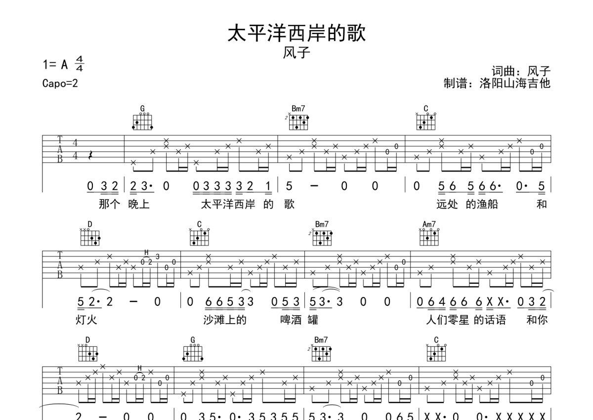 风子《太平洋西岸的歌》吉他谱 - G调弹唱六线谱
