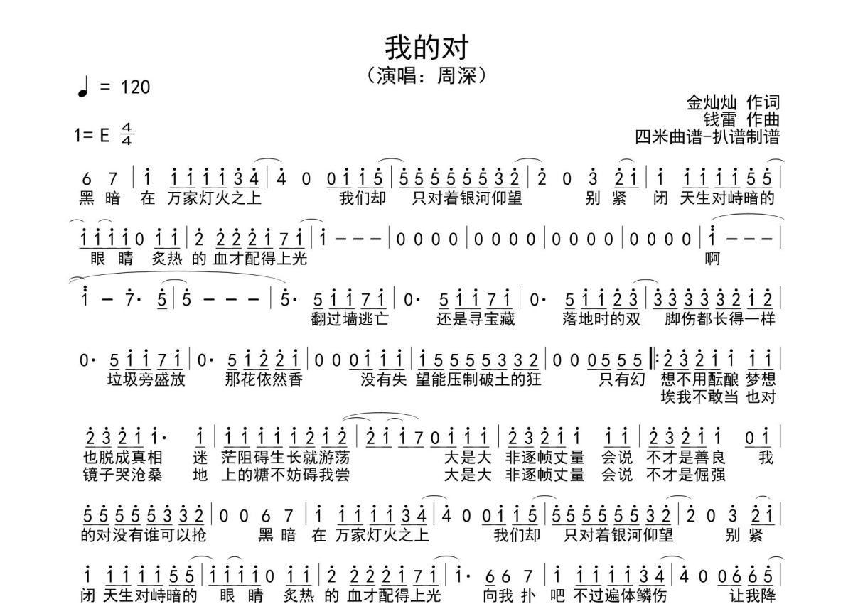 《我的对》是周深演唱的一首歌曲,拍号为4/4拍,这份简谱共有一张高清图谱,图谱由 @SRV7758521 编配上传。