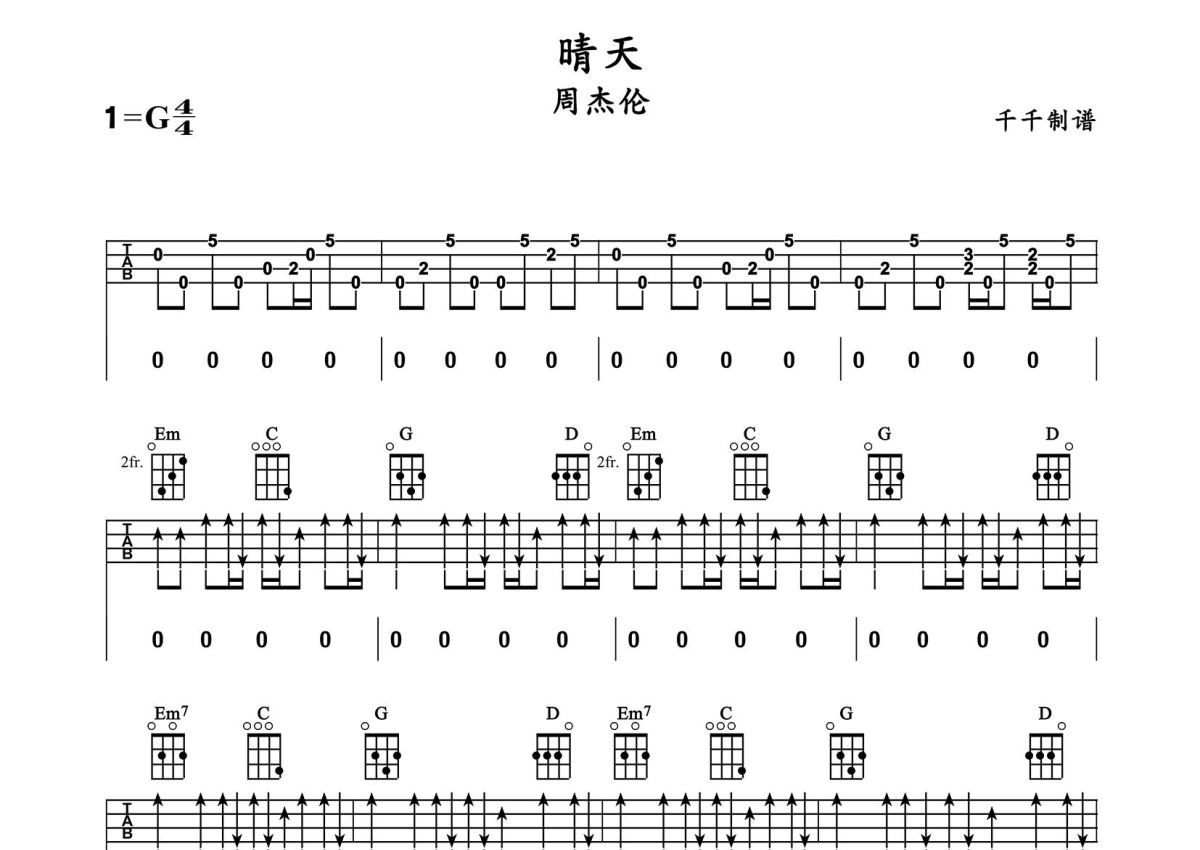 《晴天》是周杰伦演唱的一首歌曲,拍号为4/4拍,歌曲原调为G调,本尤克里里谱采用的是G调指法编配,演奏时不需要使用变调夹即为原调,这份尤克里里谱共有三张高清图谱,图谱由 @千千 编配上传,图谱使用四线谱编配,包含尤克里里和弦指法、简谱以及歌词部分,使用这份晴天尤克里里谱,可以让你更加方便地掌握这首歌曲的弹唱技巧,快来尝试吧。