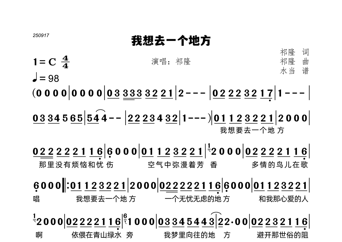 《我想去一个地方》是祁隆演唱的一首歌曲,拍号为4/4拍,歌曲速度为每分钟98拍,这份简谱共有一张高清图谱,图谱由 @水当 编配上传。