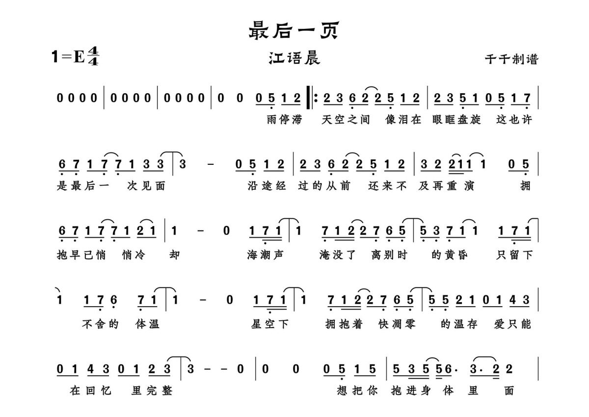 《最后一页》是江语晨江语晨演唱的一首歌曲,拍号为4/4拍,这份简谱共有一张高清图谱,图谱由 @千千 编配上传。
