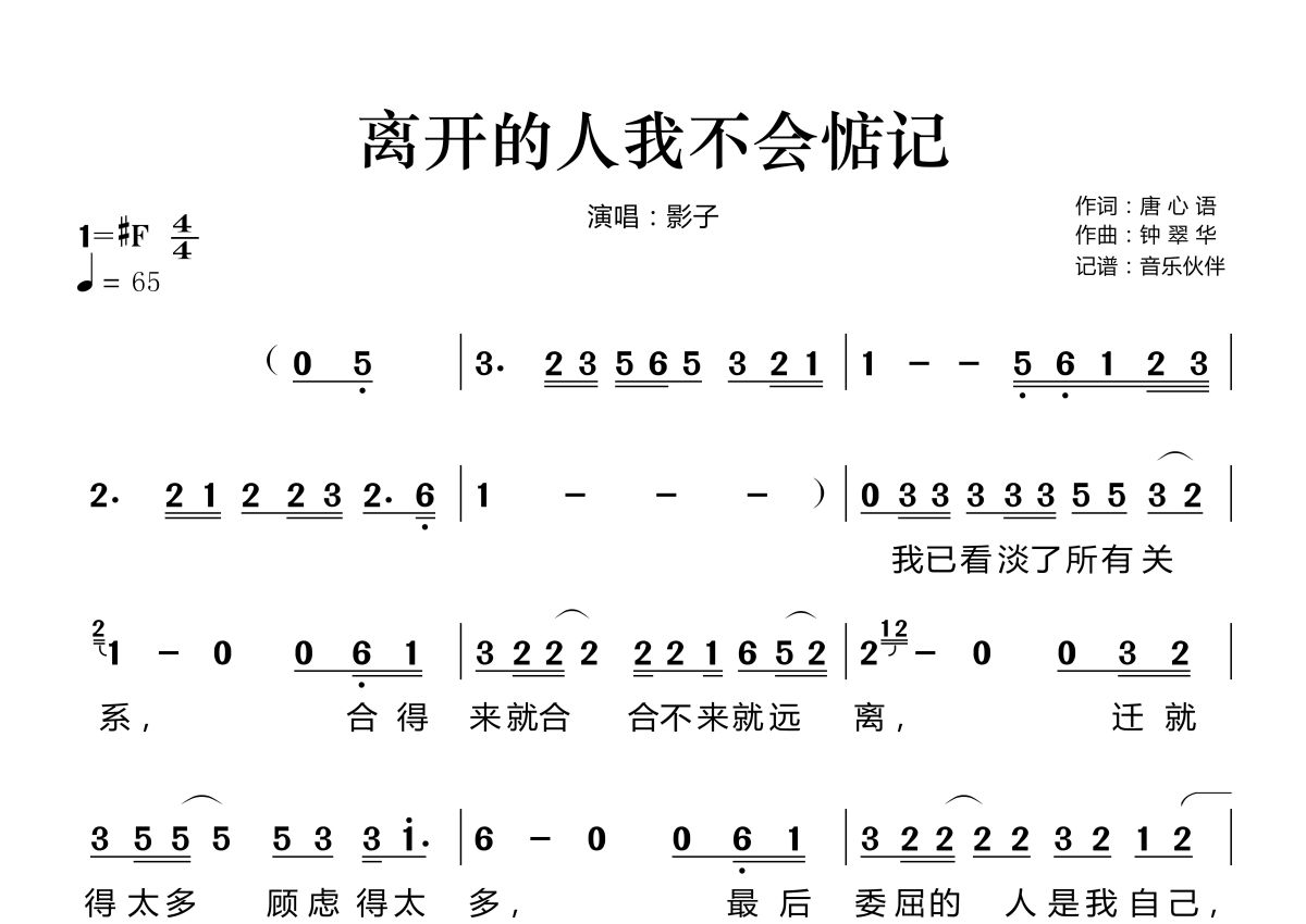 《离开的人我不会惦记》是影子演唱的一首歌曲,拍号为4/4拍,歌曲速度为每分钟65拍,这份简谱共有两张高清图谱,图谱由 @音乐伙伴 编配上传。
