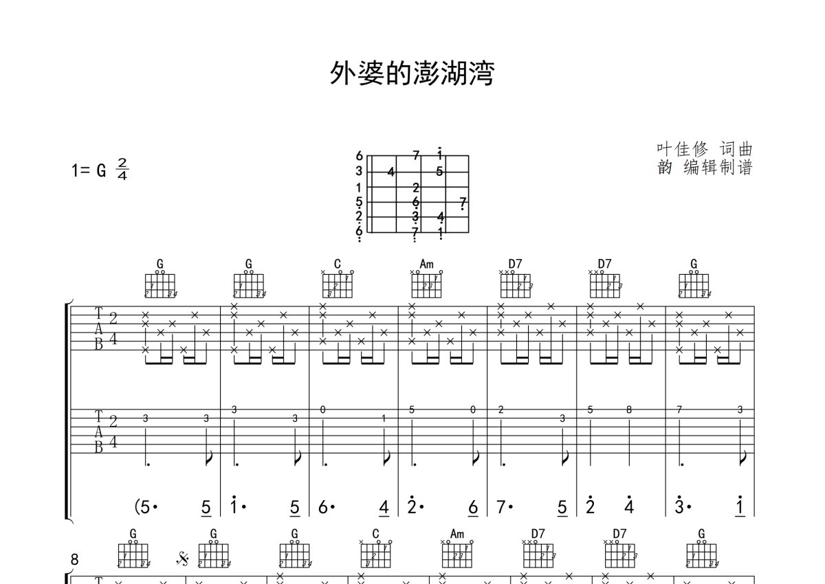 叶佳修《外婆的澎湖湾》吉他谱 - G调弹唱六线谱