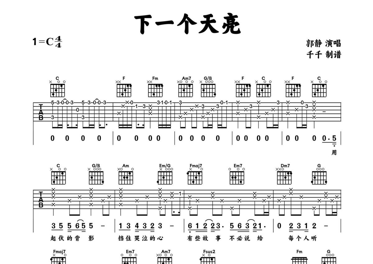 下一个天亮吉他谱 - 郭静演唱 - C调弹唱六线谱