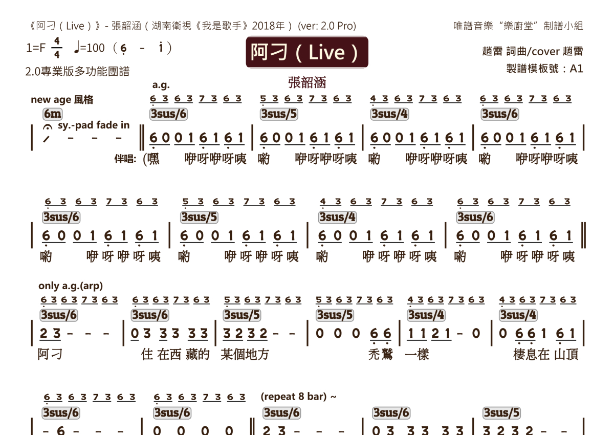 张韶涵《阿刁(Live)》乐队总谱 - 2.0版多功能团谱