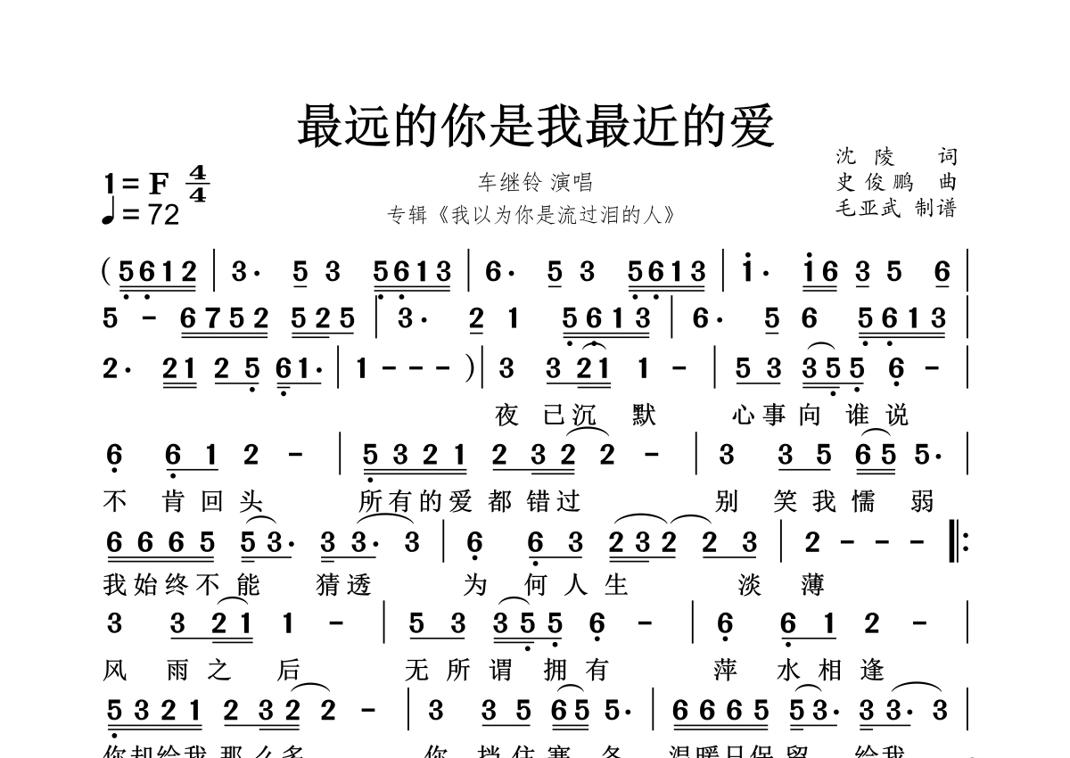 最远的你是我最近的爱简谱 - 车继铃演唱