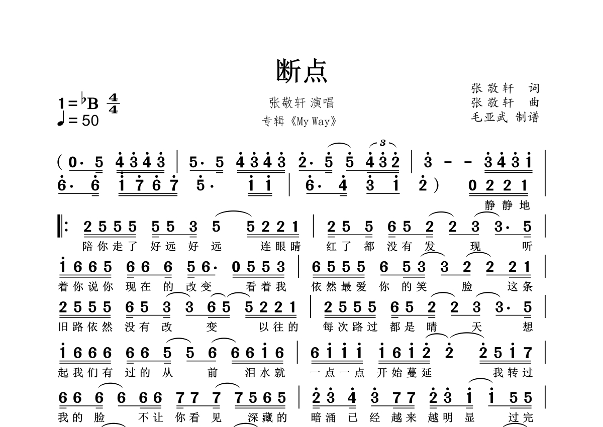 《断点》是张敬轩演唱的一首歌曲,拍号为4/4拍,这份简谱共有一张高清图谱,图谱由 @秋天的童话 编配上传。