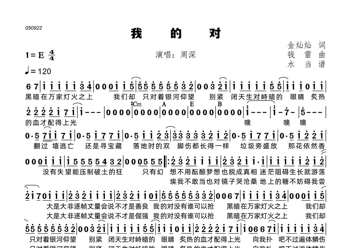 《我的对》是周深演唱的一首歌曲,拍号为4/4拍,歌曲速度为每分钟120拍,这份简谱共有一张高清图谱,图谱由 @水当 编配上传。