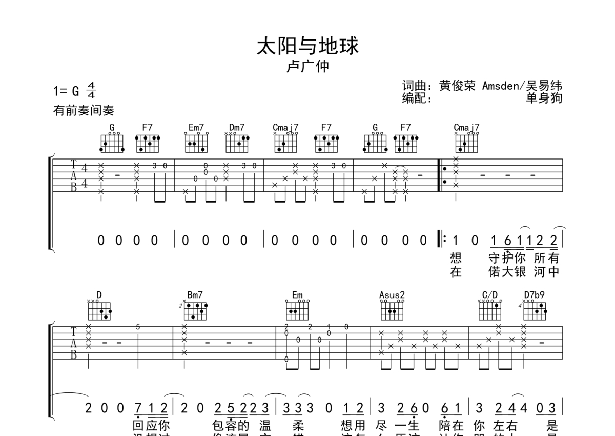 卢广仲《太阳与地球》吉他谱 - G调弹唱六线谱