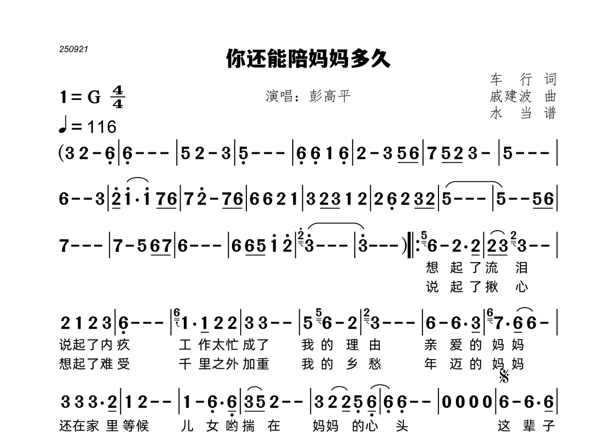 你还能陪妈妈多久简谱 - 彭高平演唱