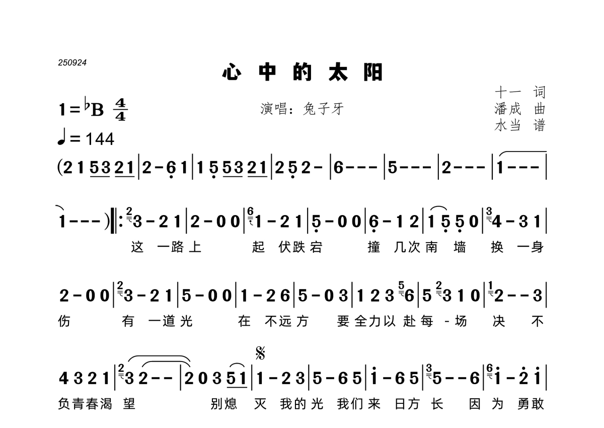 《心中的太阳》是兔子牙演唱的一首歌曲,拍号为4/4拍,歌曲速度为每分钟144拍,这份简谱共有一张高清图谱,图谱由 @水当 编配上传。