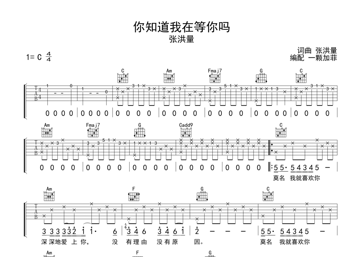 你知道我在等你吗吉他谱 - 张洪量演唱 - C调弹唱六线谱