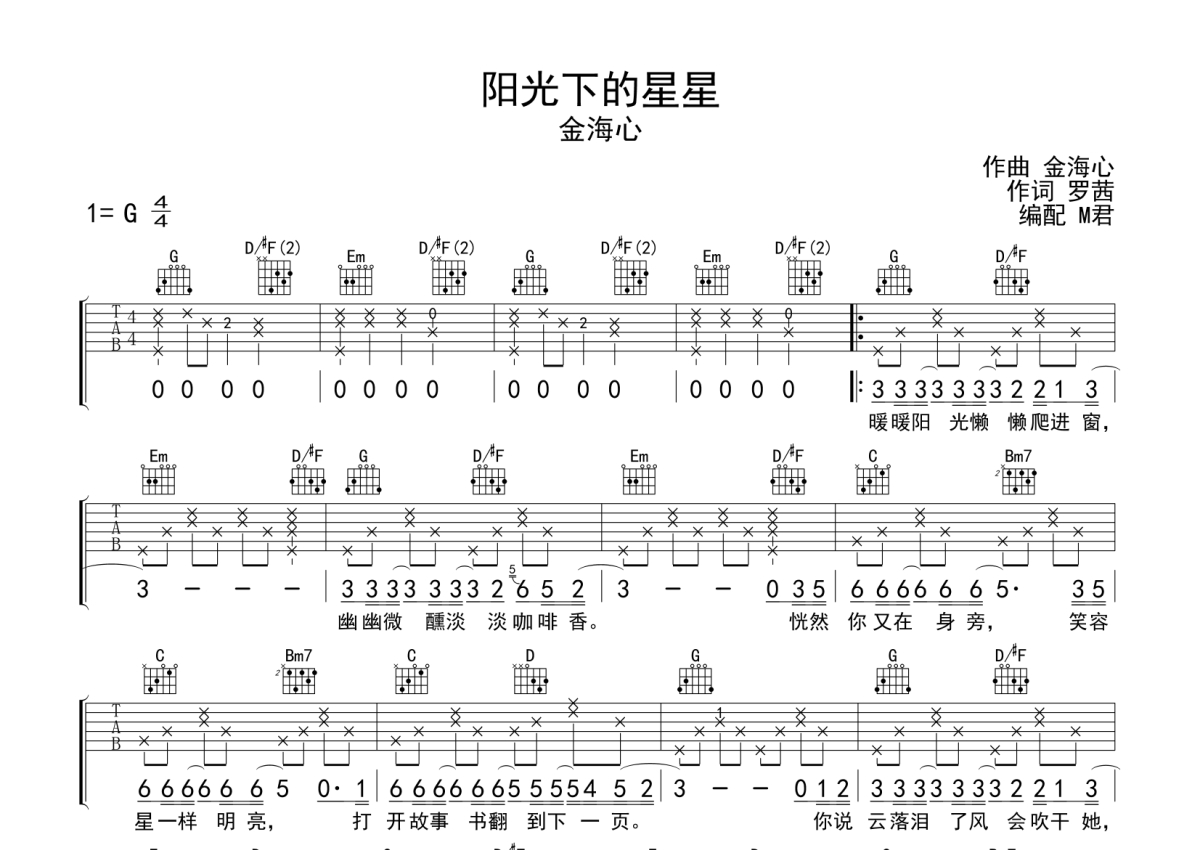 阳光下的星星吉他谱 - 金海心演唱 - G调弹唱六线谱
