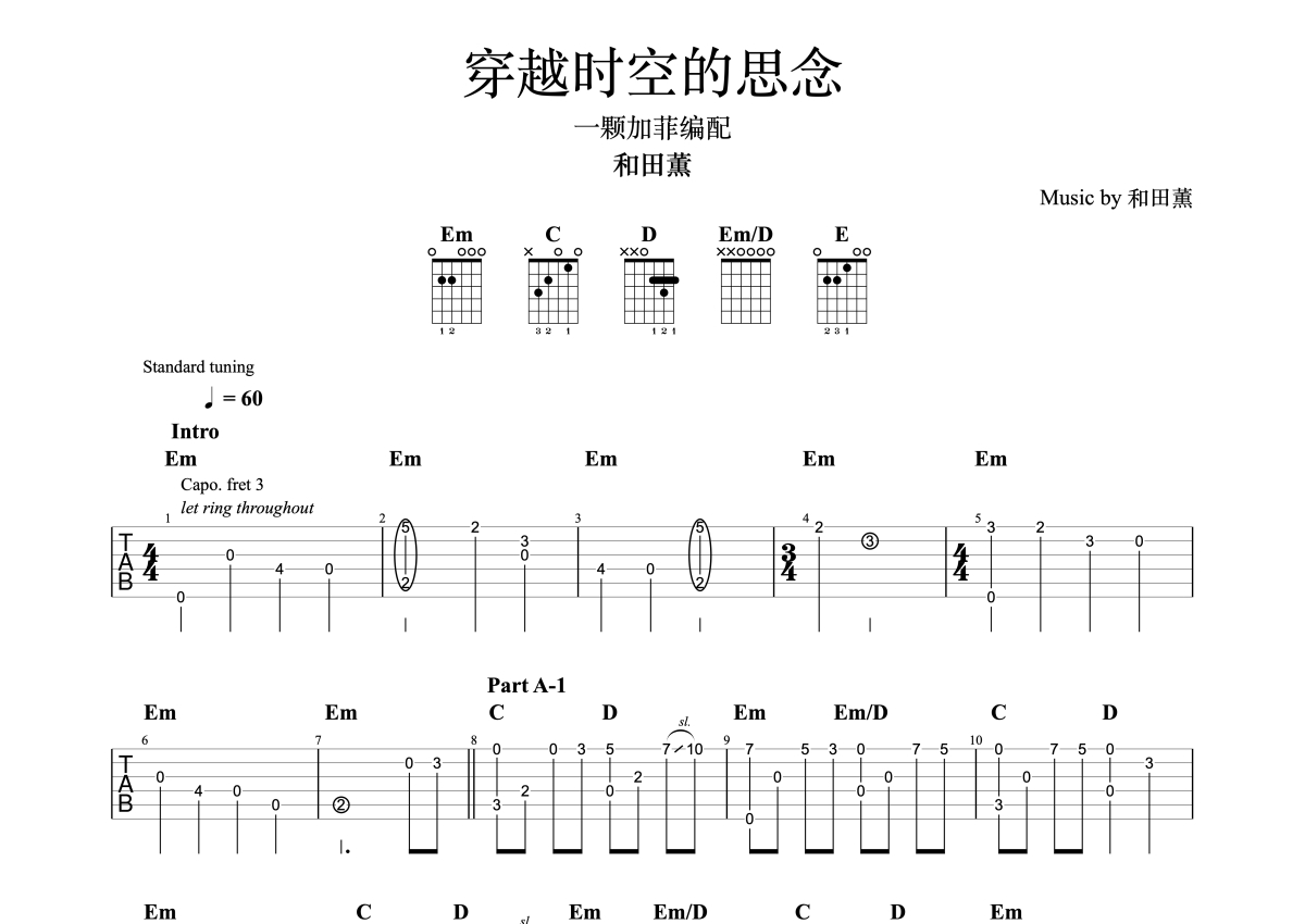 《穿越时空的思念》是和田薫演唱的一首歌曲,本吉他谱采用的是G调指法编配,这份吉他谱共有两张高清图谱,图谱由 @一颗加菲 编配上传,图谱使用六线谱编配,曲谱配备了相关的音频提供试听,使用这份穿越时空的思念吉他谱,可以让你更加方便地掌握这首歌曲的演奏技巧,快来尝试吧。