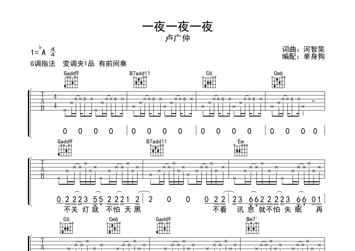 一夜一夜一夜吉他谱 - 卢广仲演唱 - G调弹唱六线谱